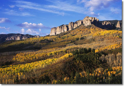 It was a late autumn afternoon and I was driving down a dirt road on the western slopes of the Colorado Rockies. Rounding a sharp curve I found myself presented with this amazing vista of the aspen-covered valley below. Being in no hurry, I set up my camera, took out some bagels and cheese, and enjoyed a simple meal while watching the fall colors around me take on the glow of the setting sun. |